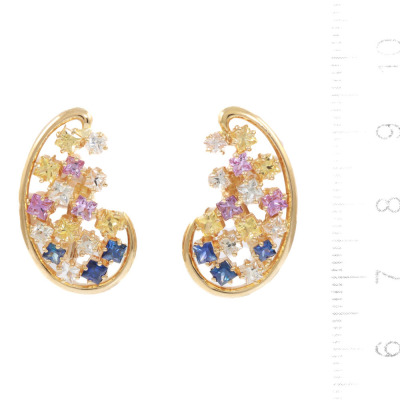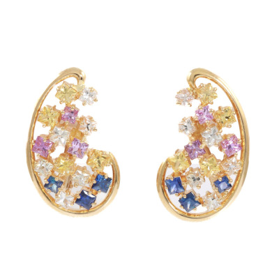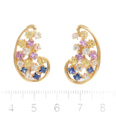 Jeunet Sapphire screwback, clip-on earrings with princess cut multi-colour Natural Sapphires totalling 4.23ct. 18ct yellow gold. Weight: 11.8g. (Pre-owned)