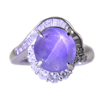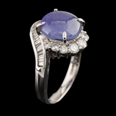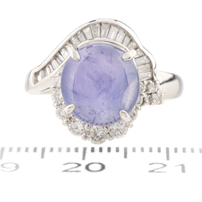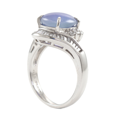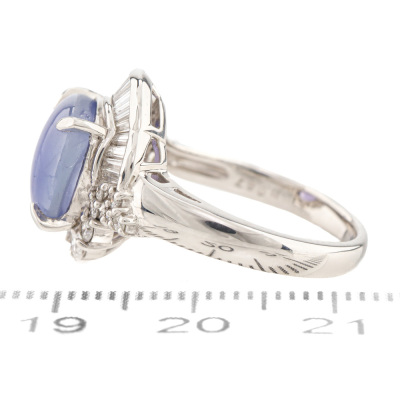 Sapphire and Diamond ring with oval shape cabochon cut Natural Star Sapphire of 4.29ct and round & baguette cut Natural Diamonds totalling 0.67ct (Estimated grading: H-I SI). Platinum - 900. Ring size K. Band width: 2.3mm - 2.8mm. Weight: 8.8g. (Pre-owned)