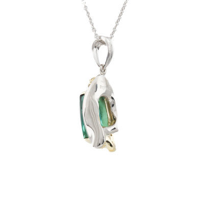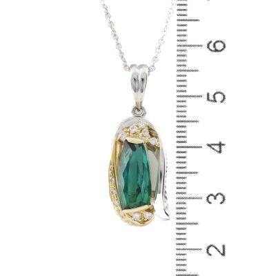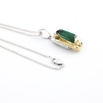 Tourmaline and Diamond pendant with fancy cut Natural Green Tourmaline of 4.35ct and round Natural Diamonds totalling 0.17ct. Platinum - 900, 18ct yellow and white gold and with 18ct white gold 40.5cm chain. Weight: 11.1g. (pre-owned)