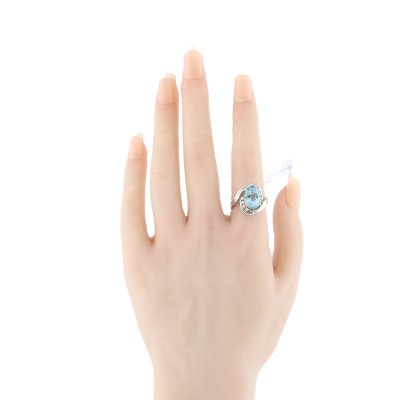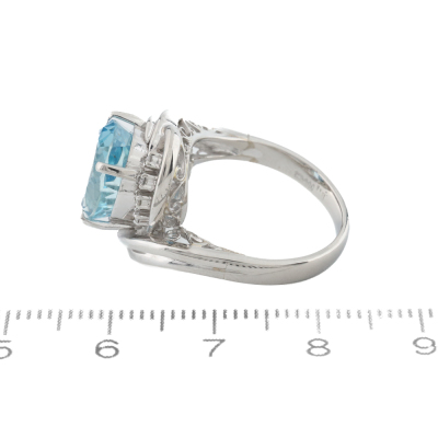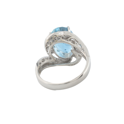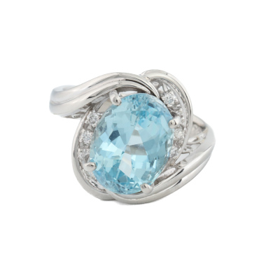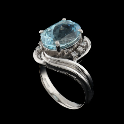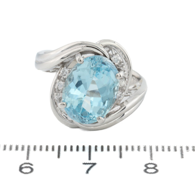 Aquamarine and Diamond ring with oval shape Natural Aquamarine of 4.36ct and round Natural Diamonds totalling 0.13ct. Platinum - 900. Ring size L. Band width: 2.8mm. Weight: 9.6g. (Pre-owned)