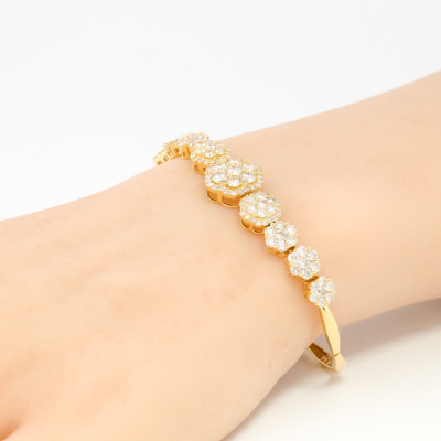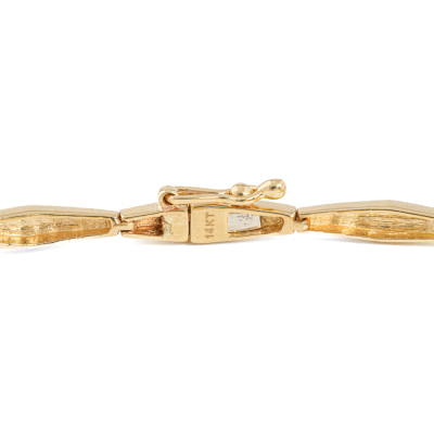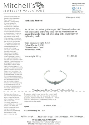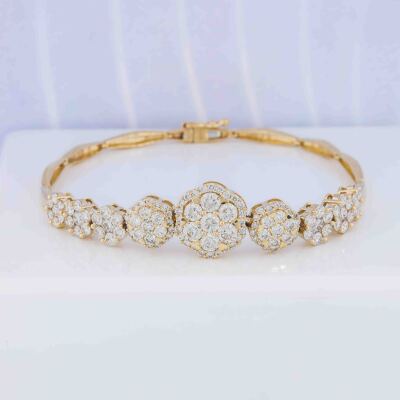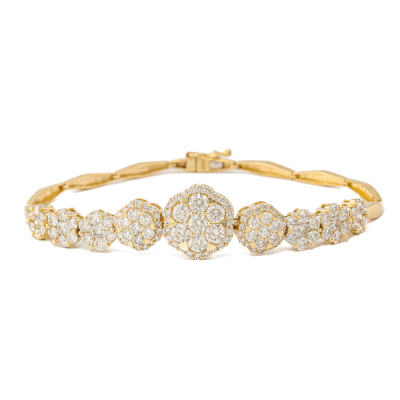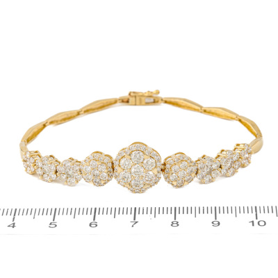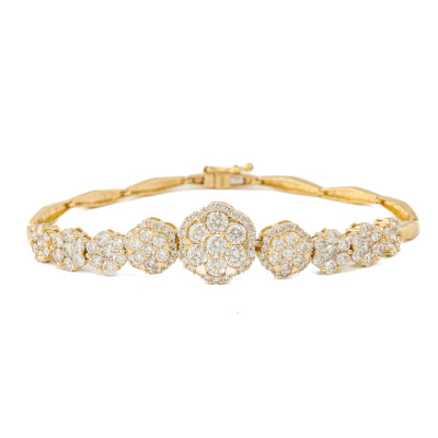 Diamond bracelet with 123 round Natural Diamonds totalling 4.36ct (Estimated grading: H-J SI). Eight graduated motifs with three centre motifs set in heart-shaped claw setting. 14ct yellow gold. Length: 18.5cm. Weight: 11.3g. With Valuation Certificate #421158. (New)