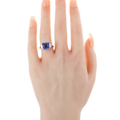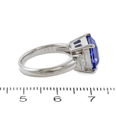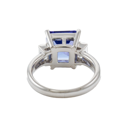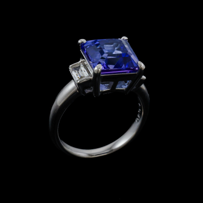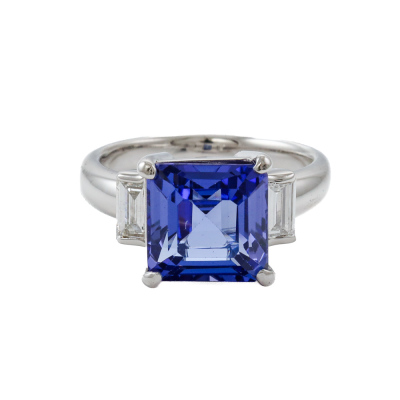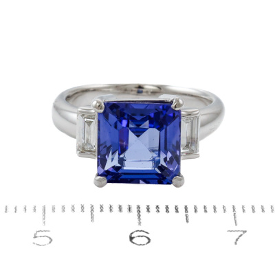 Tnazanite & Diamond ring with centre square emerald cut natural Tanzanite of 4.36ct and 2 baguette cut Natural Diamonds totalling 0.40ct (Estimated grading: G-H VS). Platinum 900. Ring size J 3/4. Band width: 2.5mm - 3.3mm. Weight: 8.4g. (Pre-owned)