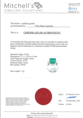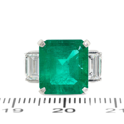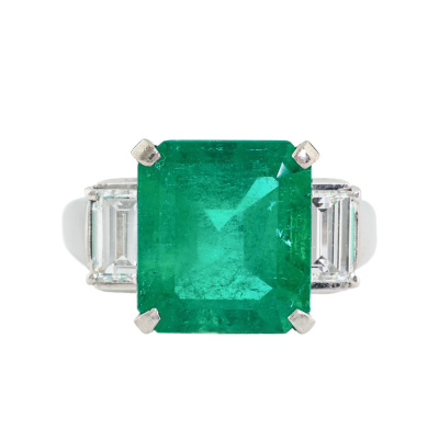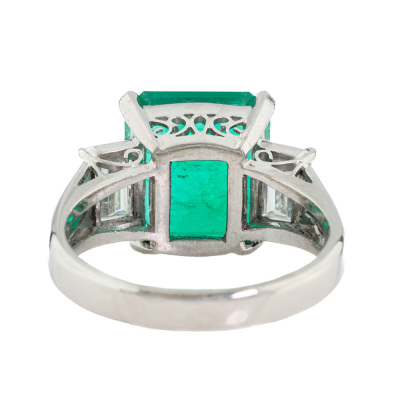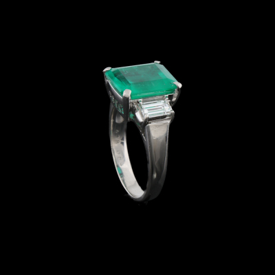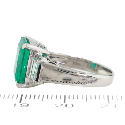 Emerald and Diamond ring with centre emerald cut Natural Emerald of 4.38ct and 2 shoulder baguette cut Natural Diamonds totalling 0.84ct (Estimated grading: G VS). Platinum 900. Ring size L. Band width: 2.8mm -3.6mm. Weight: 7.7g. With Certificate #421400. (Pre-owned)