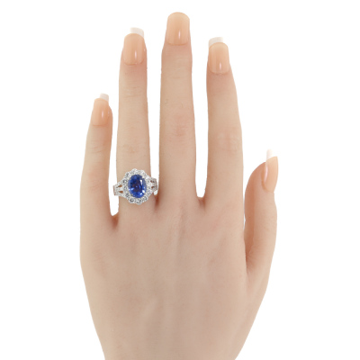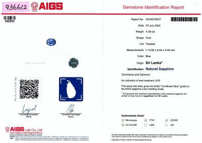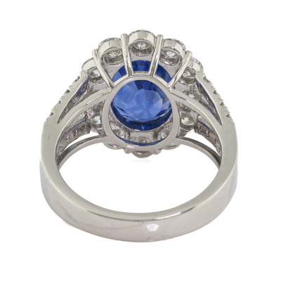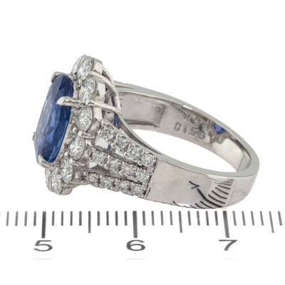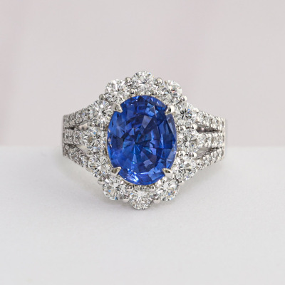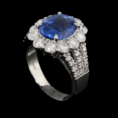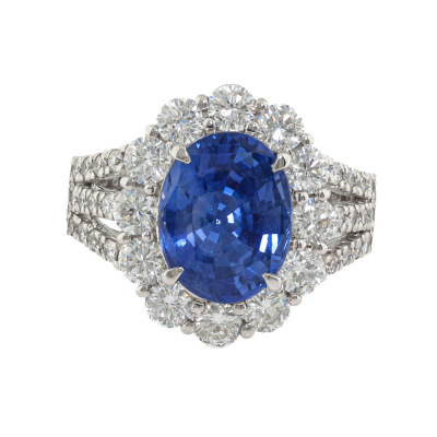 Sapphire and Diamond ring with oval shape Natural Sri Lankan Cornflower Blue Unheated Sapphire of 4.38ct (with AIGS Report #GF24070037) and round Natural Diamonds totalling 1.56ct (Estimated grading: G-H VS-SI). Platinum - 900. Ring size: M. Band width: 3.2mm - 5.0mm. Weight: 10.2g.
