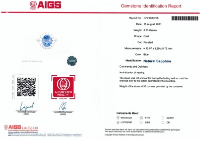 Sapphire and Diamond ring with centre oval shape Natural blue unheated Sapphire of 4.38ct (with AIGS Gemstone Identification Report #GF21080208) and round Natural Diamonds totalling 0.93ct (Estimated grading: G-H SI). Platinum-850. Ring size K1/4. Band width: 2.0mm - 2.7mm. Weight: 8.7g. (Pre-owned)