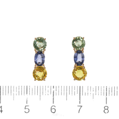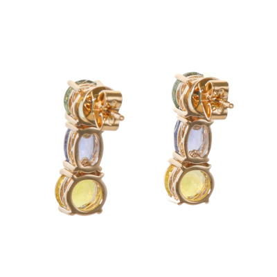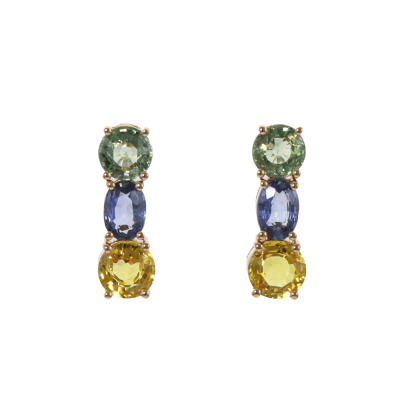 Sapphire earrings with round & oval Natural Multicolour Sapphires (colour including Green, Blue & Yellow) totalling 4.39ct. 18ct yellow gold. Weight: 4.0. (New)