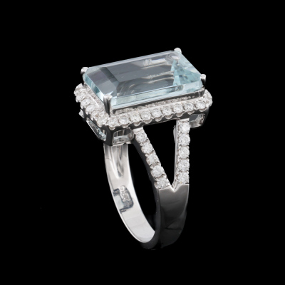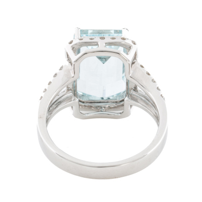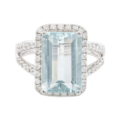 Aquamarine and Diamond ring with centre emerald cut Natural Aquamarine of approximately 4.30ct and round Natural Diamonds totalling approximately 0.50ct (Estimated grading: H-I VS-SI). 18ct white gold. Ring size M. Band width: 3mm - 4.2mm. Weight: 5.8g. (Pre-owned)