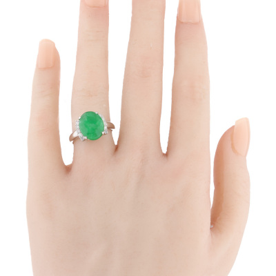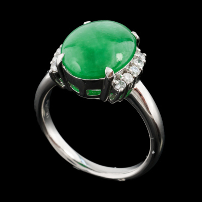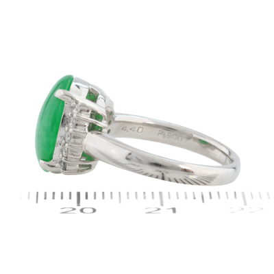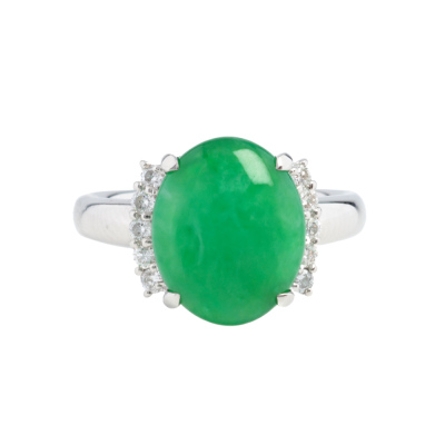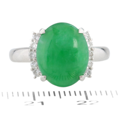 Jade and Diamond ring with oval cabochon cut Natural green Jadeite Jade - Type A of 4.40ct and round Natural Diamonds totalling 0.21ct. Platinum - 900. Ring size L 1/4. Band width: 2.3mm - 3.1mm. Weight: 8.4g. (Pre-owned)
