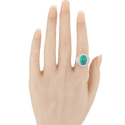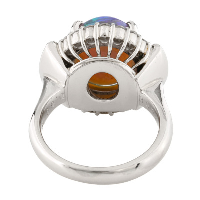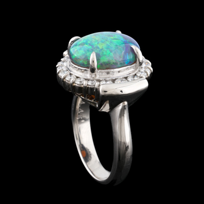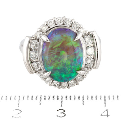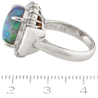 Opal and Diamond ring with oval cabochon cut solid Natural Black Opal of 4.45ct and round Natural Diamonds totalling 0.69ct (Estimated grading: G VS). Platinum - 900. Band width: 3.0mm - 3.3mm.