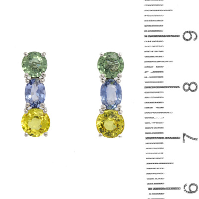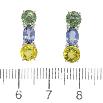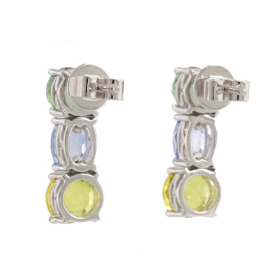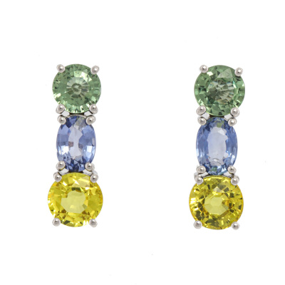 Sapphire earrings with multicolour round and oval natural blue, green and yellow Sapphires totalling 4.47ct. 18ct white gold with 18ct white gold backs