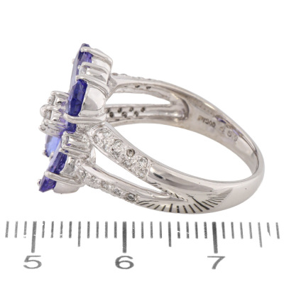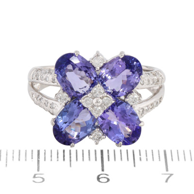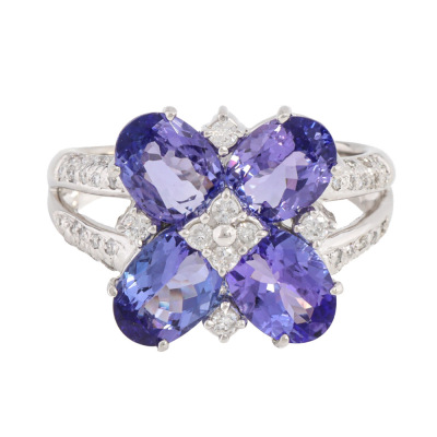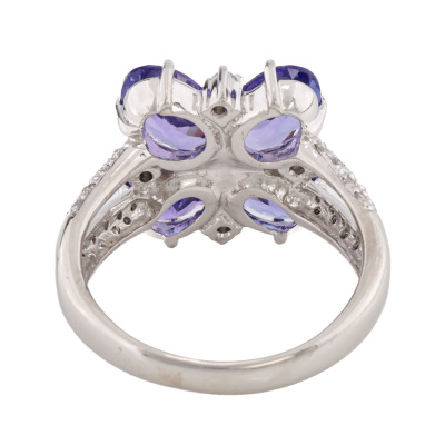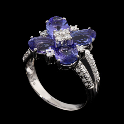Tanzanite & Diamond ring with 4 oval shape Natural Tanzanites totalling 4.59ct and round Natural Diamonds totalling 0.38ct (Estimated grading: G SI-P1). Platinum - 900. Ring size Q1/4. Band width: 2.7mm - 4.7mm. Weight: 11.0g..