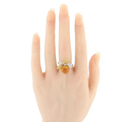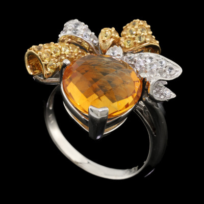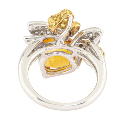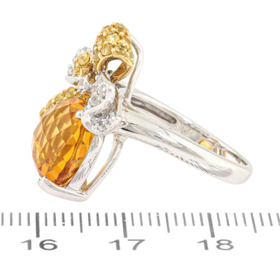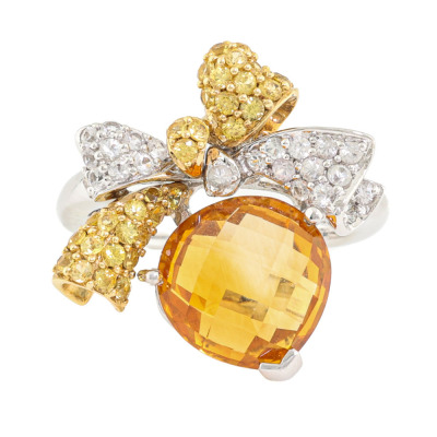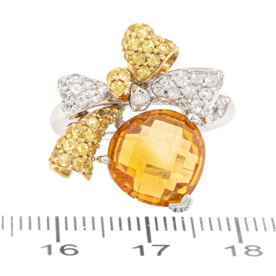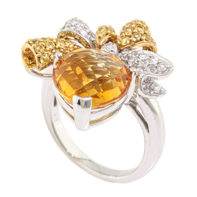 Ribbon design Citrine ring with pear checkerboard cut Natural Citrine of 4.50ct and round Natural yellow & white Sapphires totalling 0.83ct. 18ct white and yellow gold. Ring size L. Band width: 2.2mm - 2.7mm. Weight: 8.9g.
