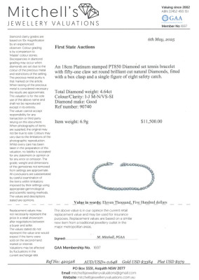 Diamond tennis bracelet with 51 round Natural Diamonds totalling 4.64ct (Estimated grading: I-J & M-N VS-SI). Platinum - 950 and Platinum - 850 tongue. Length: 18cm. Weight: 6.9g. With Valuation Certificate #420528. Pre-owned)