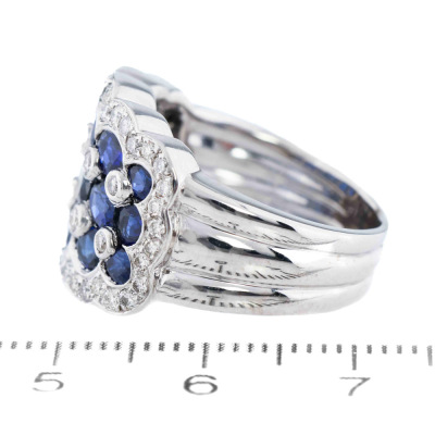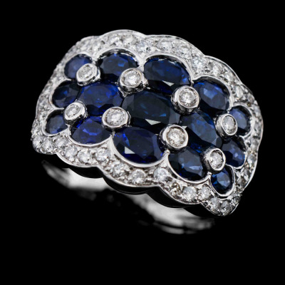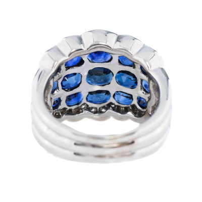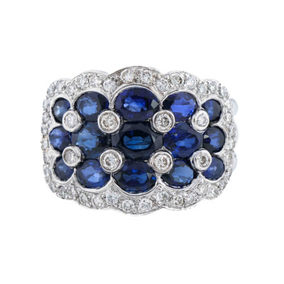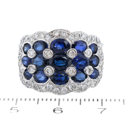 Sapphire and Diamond ring with oval shape Natural Blue Sapphires totalling 4.65ct and round Natural Diamonds totalling 0.61ct (Estimated grading: H SI). 18ct white gold. Ring size M. Band width: 5.0mm-8.3mm. Weight: 12g. (Pre-owned)