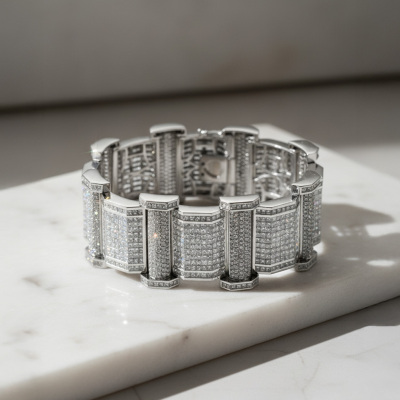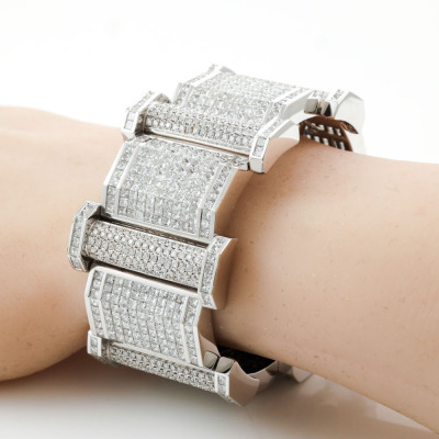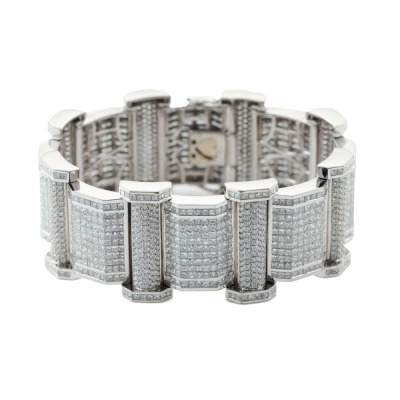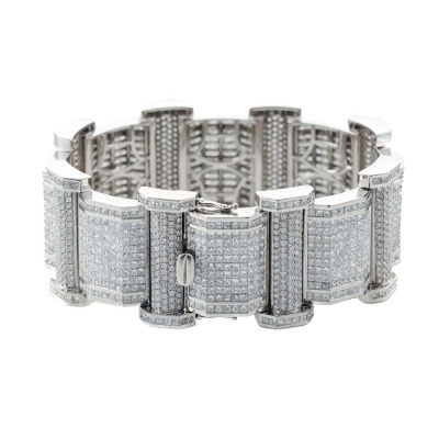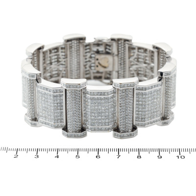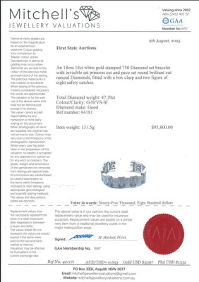 Diamond bracelet with round & princess cut Natural Diamonds totalling approximately 47.20ct (Estimated grading: G-H VS-SI). 18ct white gold. Length: 20.5cm. Width: 2.3cm & 3cm. Weight: 131.5g. With Valuation Certificate #421171. (Pre-owned)
