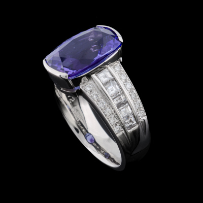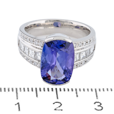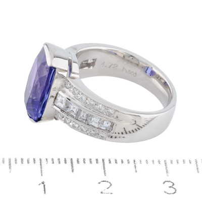 Tanzanite & Diamond Ring with a cushion cut Natural Tanzanite of 4.72ct and round & square cut Natural Diamonds totalling 0.91ct (Estimated grading: G-H SI). Platinum - 900. Ring size L. Band width: 4.4mm - 7.8mm. Weight: 12.5g. (Pre-owned).