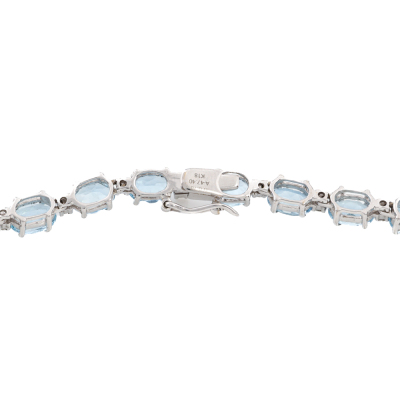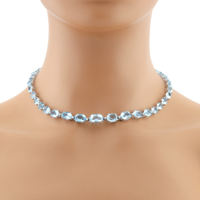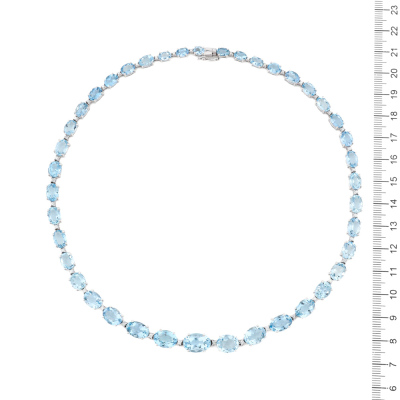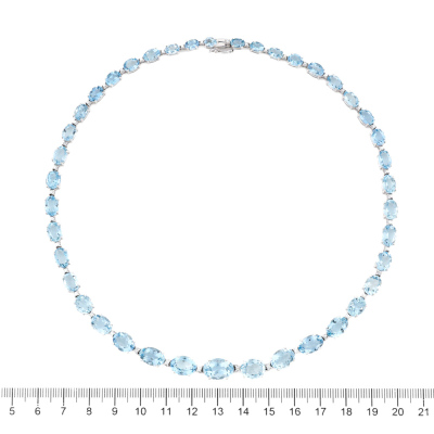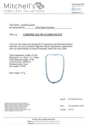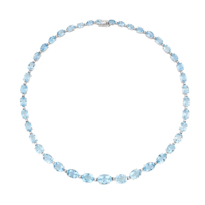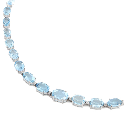 Aquamarine and Diamond necklace with 41 graduated oval shape Natural Aquamarines totalling 47.40ct and round Natural Diamonds totalling 0.78ct (Estimated grading: GHI SI-P1). 18ct white gold. Length: 42.5cm. Weight: 35.1g. With Certificate #421519. (Pre-owned)