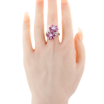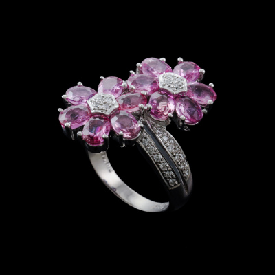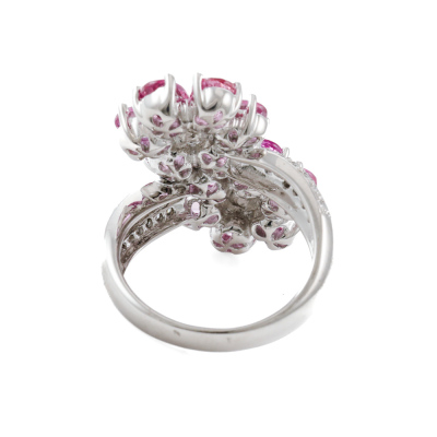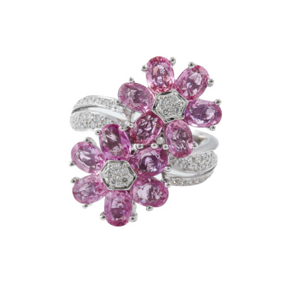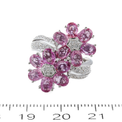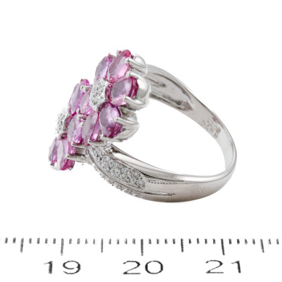 Sapphire and Diamond ring with oval shape Natural Pink Sapphires totalling 4.74ct and round Natural Diamonds totalling 0.21ct. 18ct white gold. Ring size M. Band width: 2.9mm-5.0mm. Weight: 9.2g. (Pre-owned)