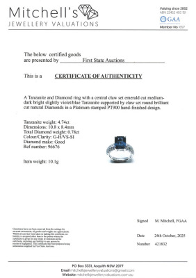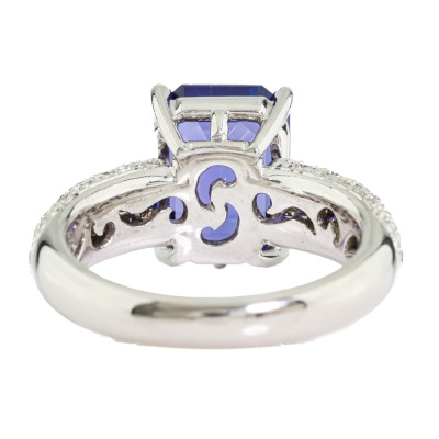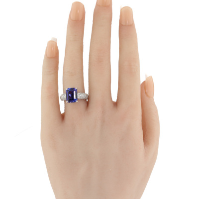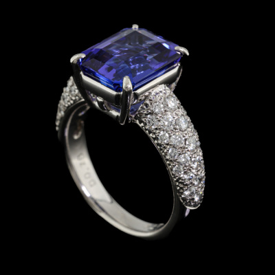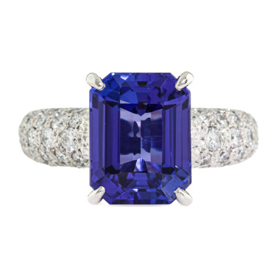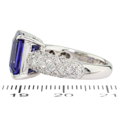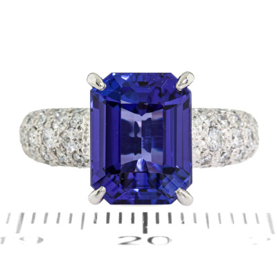 Tanzanite and Diamond ring with centre emerald cut Natural Tanzanite of 4.74ct and round Natural Diamonds totalling 0.78ct (Estimated grading: G-H VS-SI). Platinum - 900. Ring size: K. Band width: 3.1mm - 4.1mm. Weight: 10.1g. With Certificate #421832. (Pre-owned)
