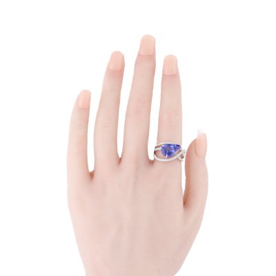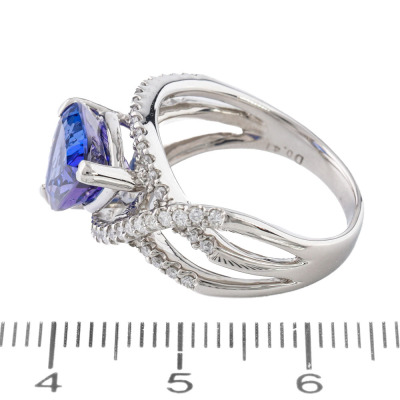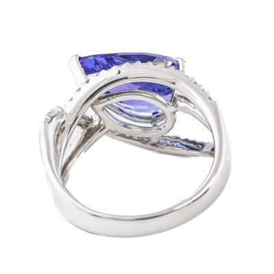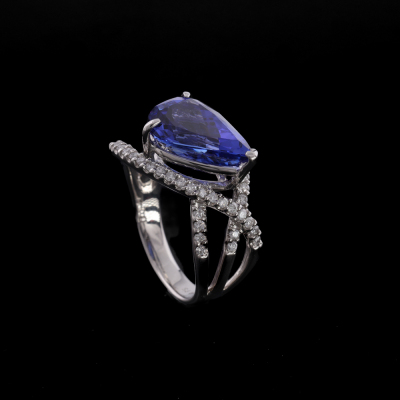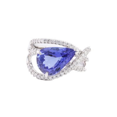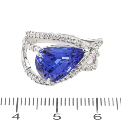 Tanzanite and Diamond ring with centre pear shape Natural Tanzanite of 4.75ct and round Natural Diamonds totalling 0.41ct (Estimated grading: H-I SI). Platinum 900. Ring size N. Band width: 3mm - 4.3mm. Weight: 9.5g. (Pre-owned)
