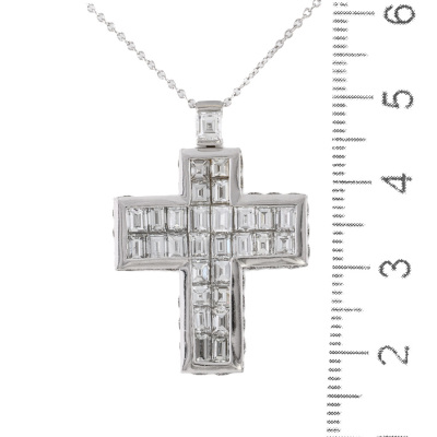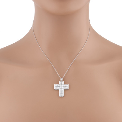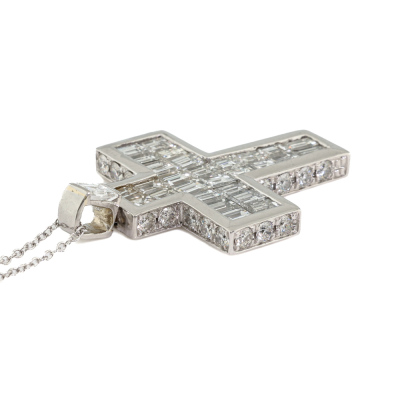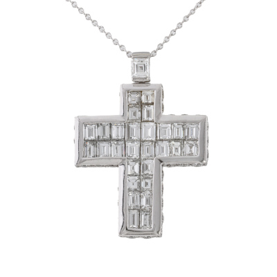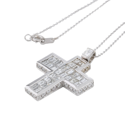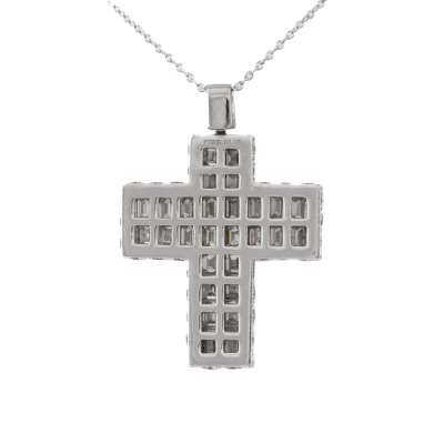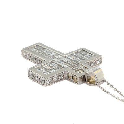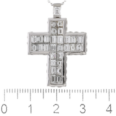 Diamond cross pendant with baguette cut Natural Diamonds totalling 3.60ct (Estimated grading: HIJ VS) and round Natural Diamonds totalling 1.18ct (Estimated grading: Natural Light Yellow & H-I SI). Platinum - 900 with 41cm 18ct white gold chain. Weight: 9.9g. With Valuation Certificate #422492.