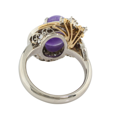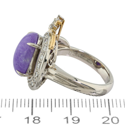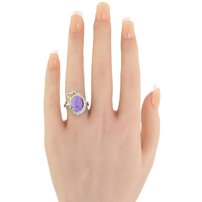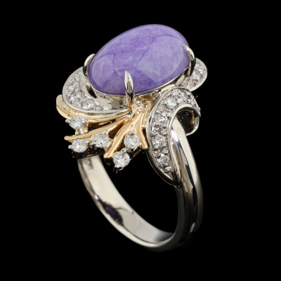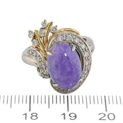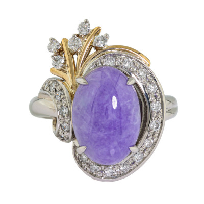 Jade and Diamond ring with centre cabochon cut Natural Lavender Jadeite Jade - Type A of 4.78ct and round Natural Diamonds totalling 0.33ct (Estimated grading: G SI). 18ct yellow gold and platinum - 900. Ring size: K1/2. Band width: 3.4mm. Weight: 13.0g.