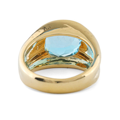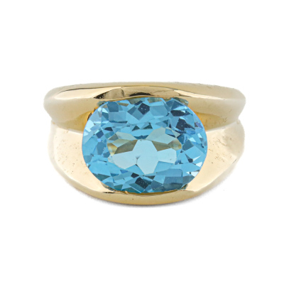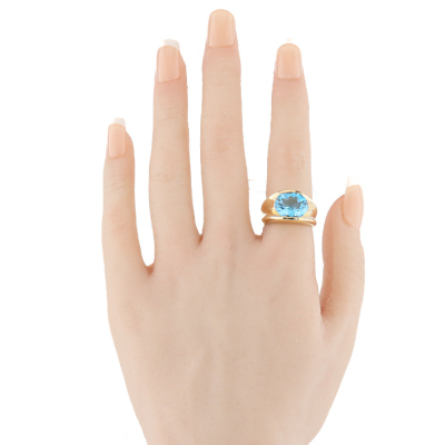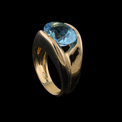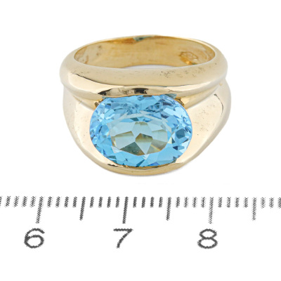 Topaz dress ring with a single oval shape Natural Blue Topaz of approximately 4.82ct. 18ct yellow gold. Ring size L1/4. Band with: 4.1mm - 10.5mm. Weight: 12.2g. (Pre-owned)