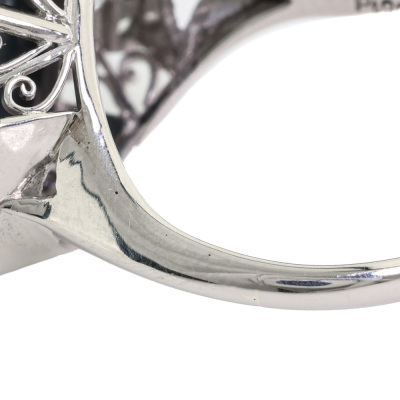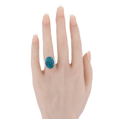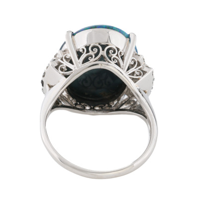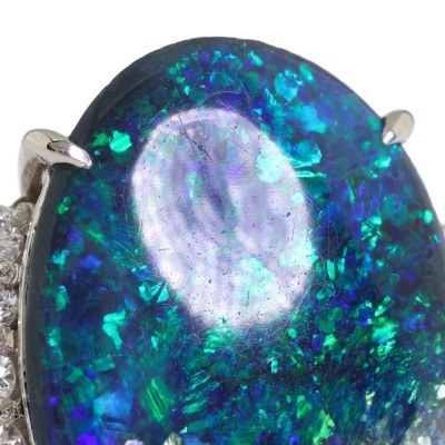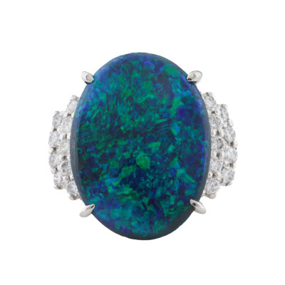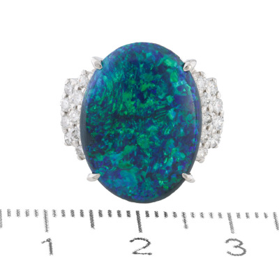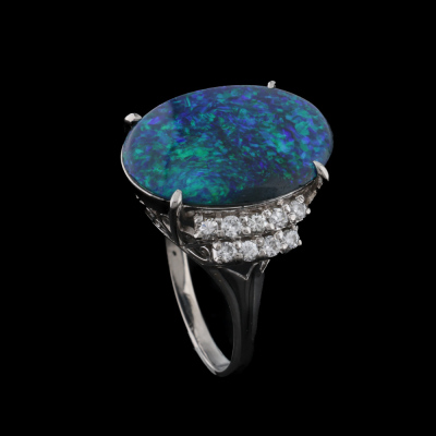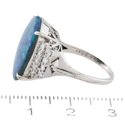 Opal and Diamond ring with centre oval cabochon cut solid Natural Black Opal of 4.90ct and round & baguette cut Natural Diamonds totalling 0.45ct (Estimated grading: G VS). Platinum - 900. Ring size: K3/4. Band width: 1.7mm - 2.1mm. Weight: 6.8g.