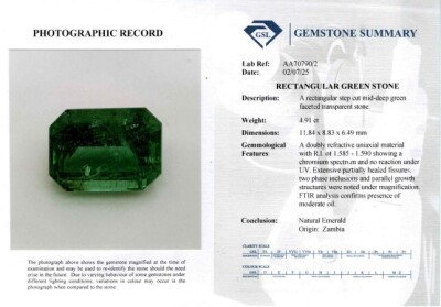 A loose emerald cut Natural Zambian Emerald of 4.91ct (with GSL Summary Report #AA70790/2). (As New)