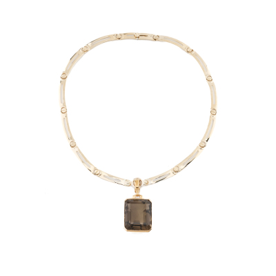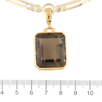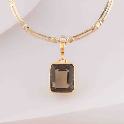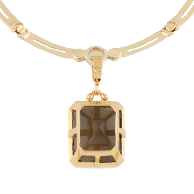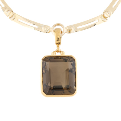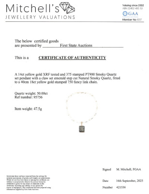 Quartz enhancer pendant with emerald cut Natural Smoky Quartz of 50.00ct. 14ct yellow gold (XRF tested, stamped '375') with 40.0cm 18ct yellow gold fancy link chain. Weight: 47.5g. With Certificate #421536. (Pre-owned)