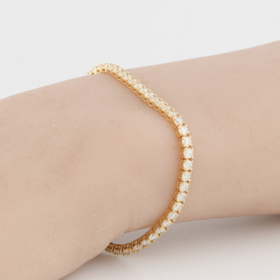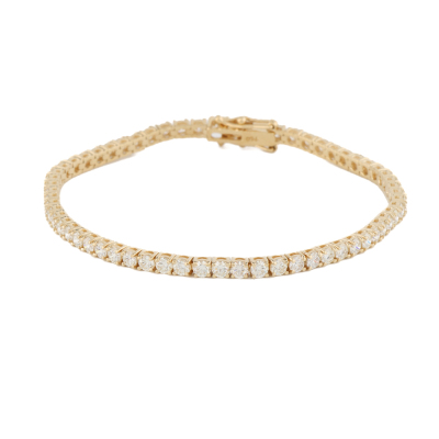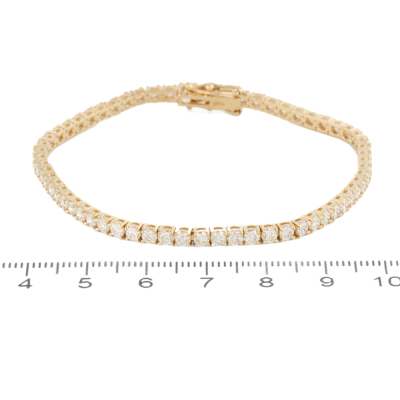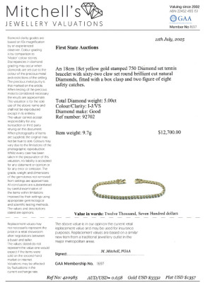Diamond tennis bracelet with 62 round Natural Diamonds totalling 5.00ct (Estimated grading: I-J VS). 18ct yellow gold. Length: 18cm. Weight: 9.7g. With Valuation Certificate #420985. (New)