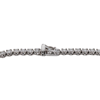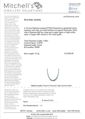 Diamond Tennis necklace with graduated round Natural Diamonds totalling 5.00ct (Estimated grading: GH P1). Platinum - 900 (XRF tested, stamped pt900) and platinum 600 box clasp & tongue 18ct white gold (XRF tested, stamped pt850). Length: 43.5cm. Weight: 34.2g. With Certificate #422444.