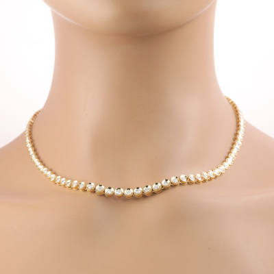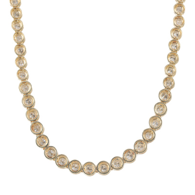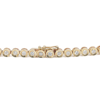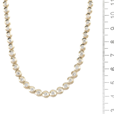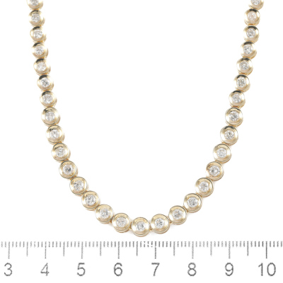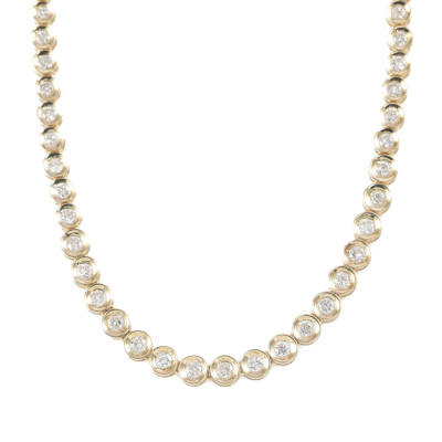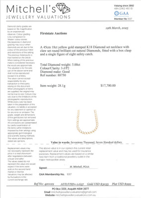 Diamond tennis necklace with 83 graduated round Natural Diamonds totalling 5.00ct (Estimated grading: I-J P2). 18ct yellow gold. Length: 43.0cm. Weight: 28.1g. With Certificate #420129. (Pre-owned)
