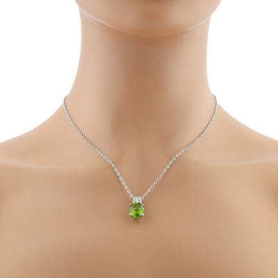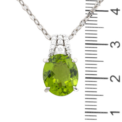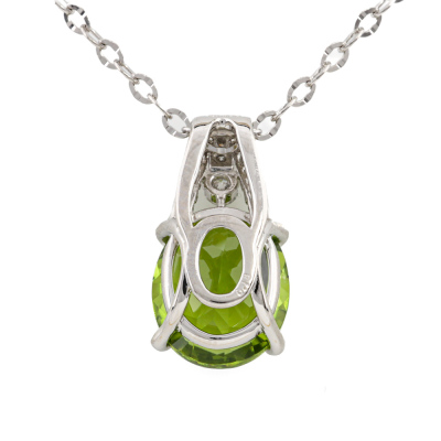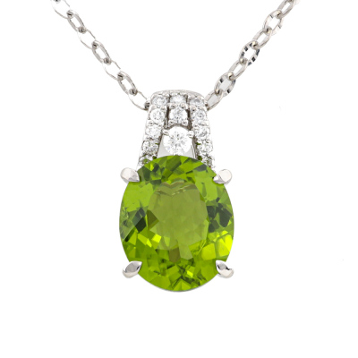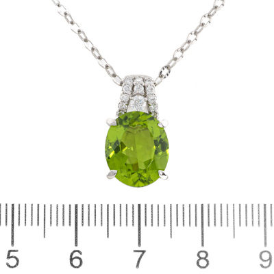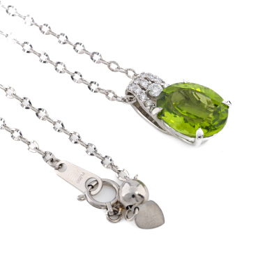 Peridot and Diamond pendant with oval shape Natural Peridot of 5.01ct and round Natural Diamonds totalling 0.18ct. Platinum - 850 with 45cm Platinum - 850 adjustable chain. Weight: 7.2g. (pre-owned)