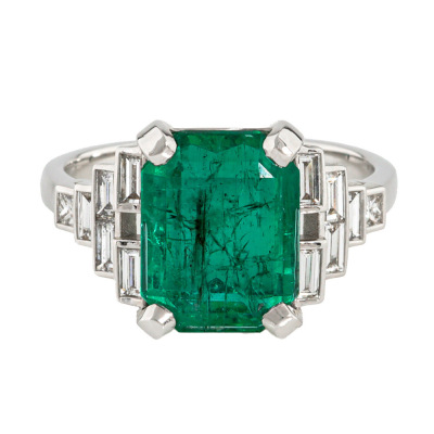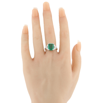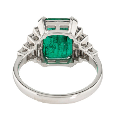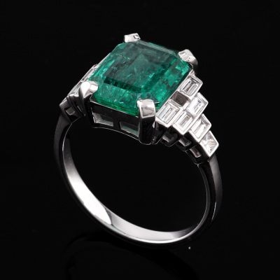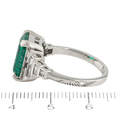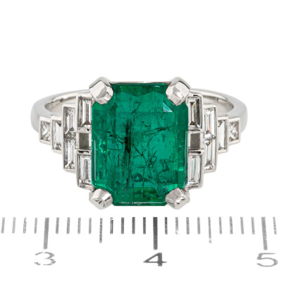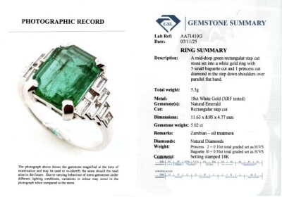Emerald and Diamond ring with centre emerald cut Natural Zambian Emerald of approximately 5.02ct and baguette & princess cut Natural Diamonds totalling approximately 0.60ct (Estimated grading: H VS). 18ct white gold. Ring size P. Band width: 2.2mm - 2.1mm. Weight: 5.3g. With GSL Gemstone Summary Report #AA71410/3. (Pre-owned).