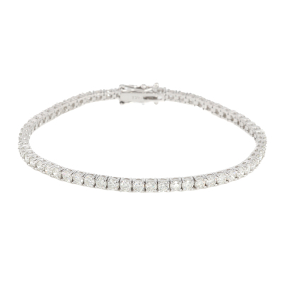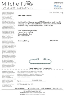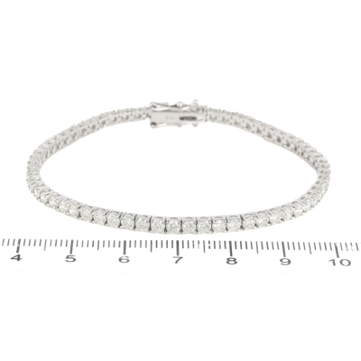 Diamond tennis bracelet with 62 round Natural Diamonds totalling 5.06ct (Estimated grading: H-I VS). 18ct white gold. Length: 18cm. Weight: 9.3g. With Valuation Certificate #422015. (New)