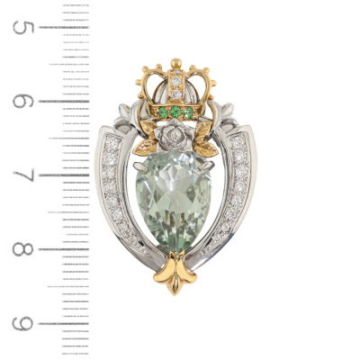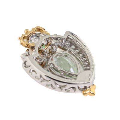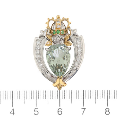 Quartz, Tourmaline and Diamond pendant with a centre pear shape Natural Prasiolite (Green Quartz) of 5.06ct, 3 round Natural Green Tourmaline totalling 0.06ct and round Natural Diamonds totalling 0.23ct. 18ct yellow and white gold. No chain provided