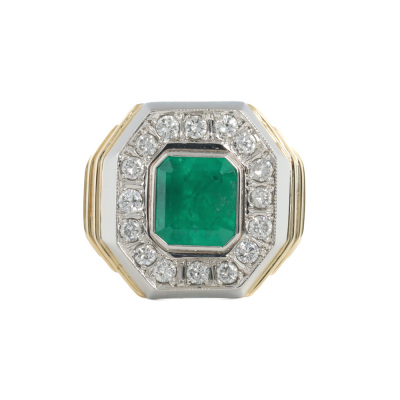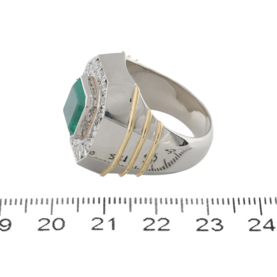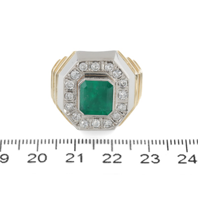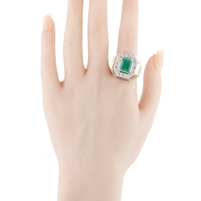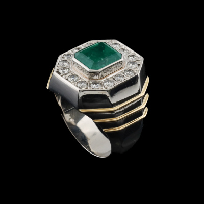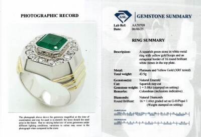 Emerald and Diamond mens ring with emerald cut Natural Colombian Emerald of 5.08ct and round Natural Diamonds totalling 1.60ct (Estimated grading: G-H SI-P1). 18ct yellow gold and Platinum - 900. Ring size T 3/4. Band width: 6.9mm - 8.4mm. Weight: 43.9g. With GSL Report #AA70709. (Pre-owned)