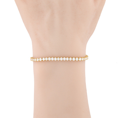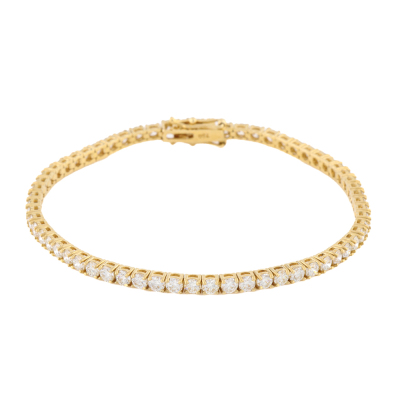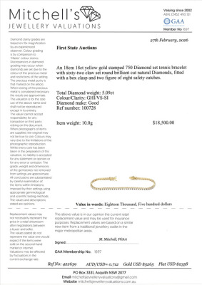 Diamond tennis bracelet with 62 round natural Diamonds totalling 5.09ct (Estimated grading: GHI VS-SI). 18ct yellow gold. Length: 18cm. Weight: 10.0g. With Valuation Certificate #422639.