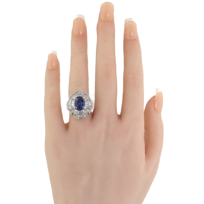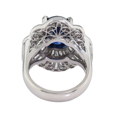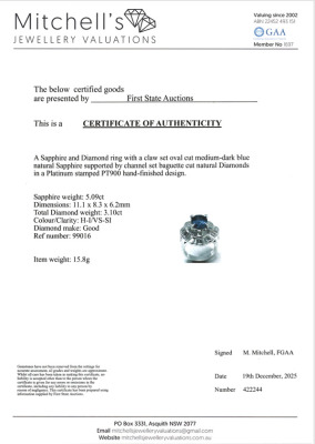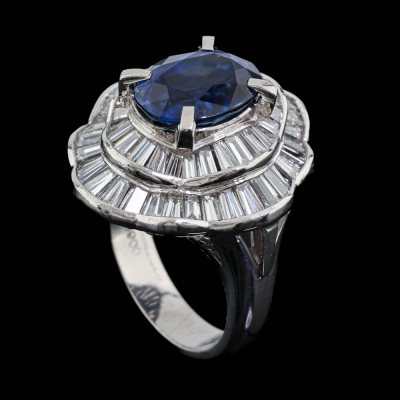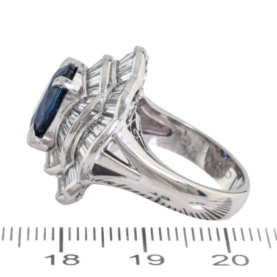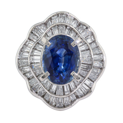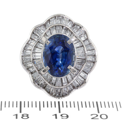 Sapphire & Diamond ring with centre oval shape Natural Blue Sapphire of 5.09ct and baguette cut Natural Diamonds totalling 3.10ct (Estimated grading: H-I VS-SI). Platinum - 900. Ring size L. Band width: 4.1mm - 4.4mm. Weight: 15.8g. With Certificate #422244..