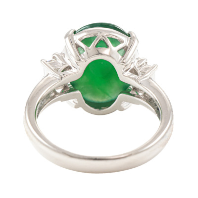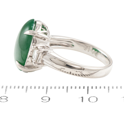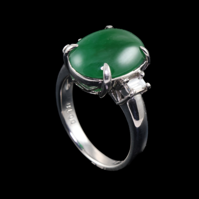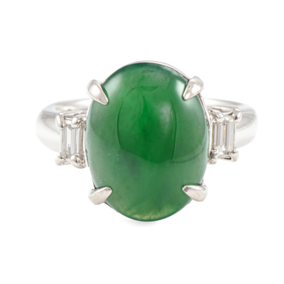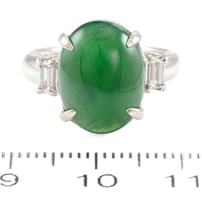 Jade and Diamond ring with oval shape cabochon cut Natural Jadeite Jade - Type A of approximately 5.14ct with 2 baguette cut Natural Diamonds totalling 0.18ct (Estimated grading: G-H VS). Platinum - 900. Ring size K. Band width: 3.5mm - 2.7mm. Weight: 7.9g. (Pre-owned)