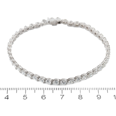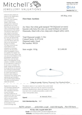 Diamond tennis bracelet with 45 round Natural Diamonds totalling 5.19ct (Estimated grading: H-I VS-SI). 18ct white gold. Length: 18cm. Weight: 10.0g. With Valuation Certificate #420527. (Pre-owned)