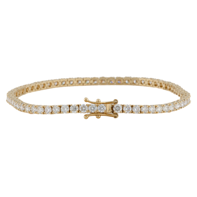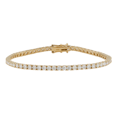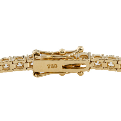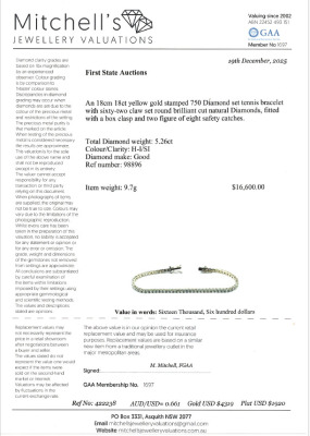Diamond tennis bracelet with 62 round Natural Diamonds totalling 5.26ct (Estimated grading: H-I SI). 18ct yellow gold. Length: 18.0cm. Weight: 9.7g. With Valuation Certificate #422238. (New)