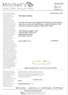 Diamond tennis bracelet with 62 round Natural Diamonds totalling 5.29ct (Estimated grading: GHI VS-SI). 18ct yellow gold. Length: 18cm. Weight: 10.1g. With Valuation Certificate #422634.