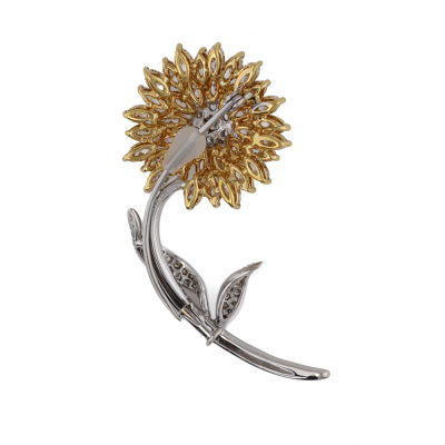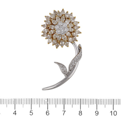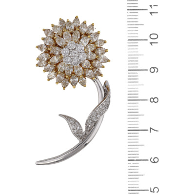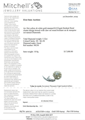 Floral design brooch with round and marquise cut Natural Diamonds totalling 5.32ct (Estimated grading: HI & KL SI). 18ct yellow and white gold. Length: 5cm. Weight: 10.9g. With Certificate #422174.