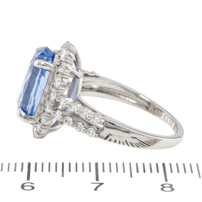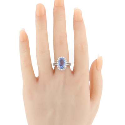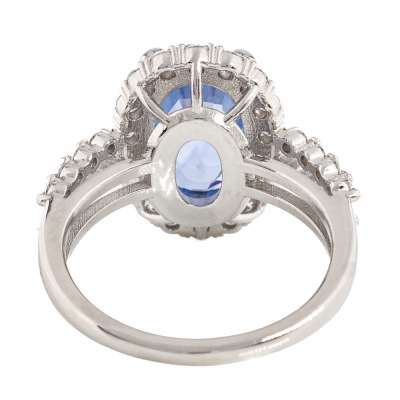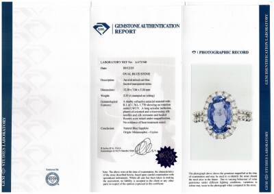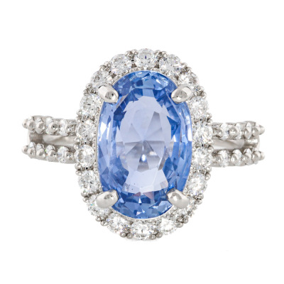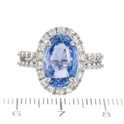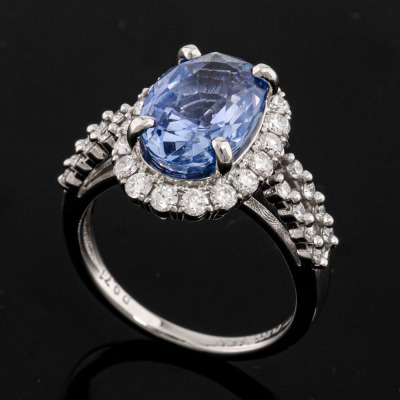 Sapphire and Diamond ring with oval shape Ceylon unheated Natural Blue Sapphire of 5.33ct (With GSL Report #AA71540) and round Natural Diamonds totalling 0.71ct (Estimated grading: G-H SI). Platinum - 900. Ring size: L3/4. Band width: 1.6mm - 3.2mm. Weight: 8.4g. (Pre-owned)