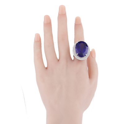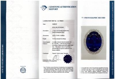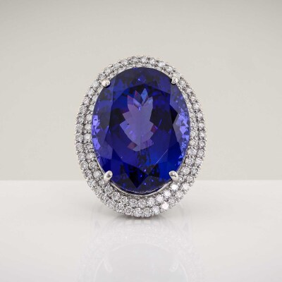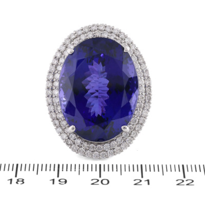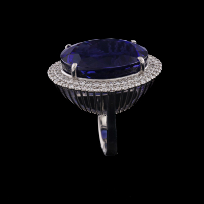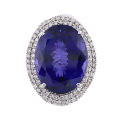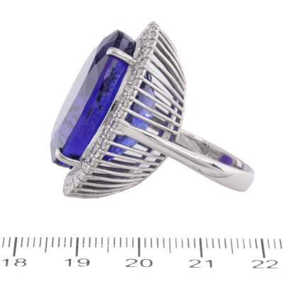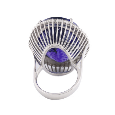 Tanzanite and Diamond ring with oval shape Natural Tanzanite of 54.21ct and round Natural Diamonds totalling 2.00ct (Estimated grading: G-H SI). Platinum - 950. Ring size L1/2. Band width: 3.8mm-2.6mm. Weight: 27.5g. With GSL Gemstone Authentication Report # AA70960/1 (Pre-owned)