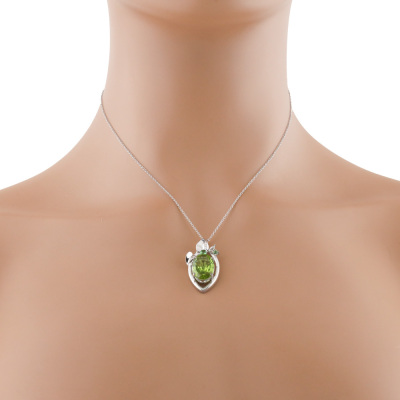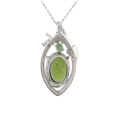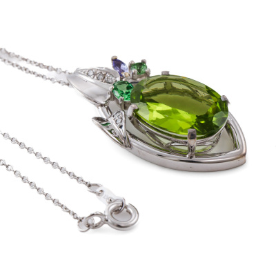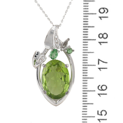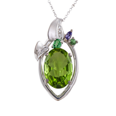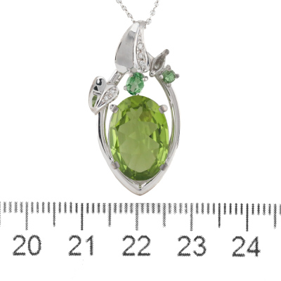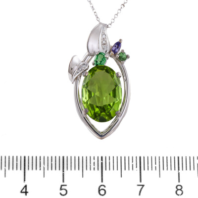 Peridot and Diamond pendant with centre oval shape Natural Peridot of 5.45ct, marquise cut Natural Tanzanite of approximately 0.08ct, round & oval shape Natural Green Tourmalines totalling approximately 0.20ct and round Natural Diamonds totalling 0.04ct. 15ct white gold (as XRF tested but stamped 'K18WG') with 40.5cm 18ct white gold chain. Weight: 8.0g.