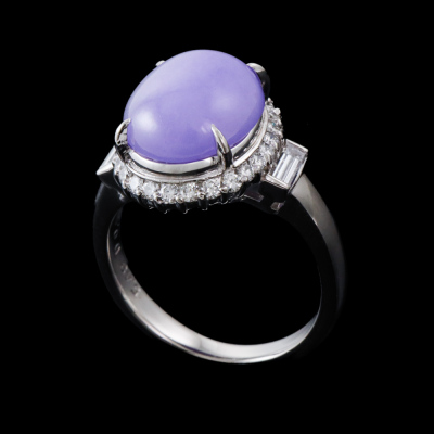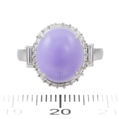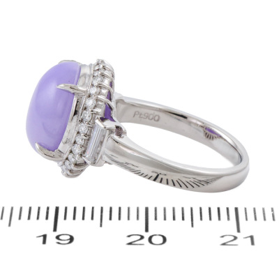 Jade and Diamond ring with oval cabochon cut Natural Lavender Jadeite Jade - Type A of 5.48ct and round & baguette cut Natural Diamonds totalling 0.55ct (Estimated grading: G SI). Platinum - 900. Band width: 2.3mm - 2.8mm