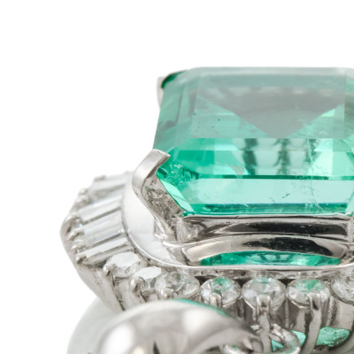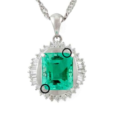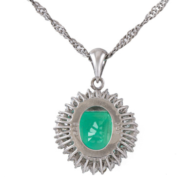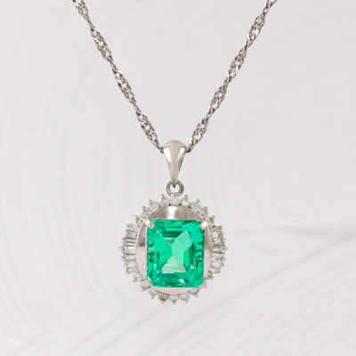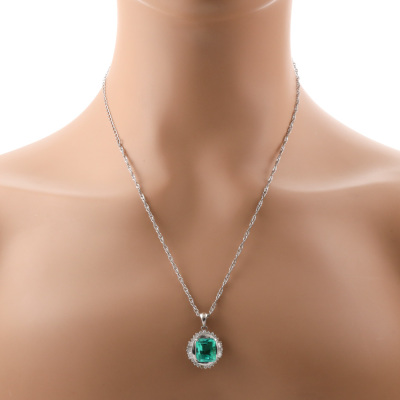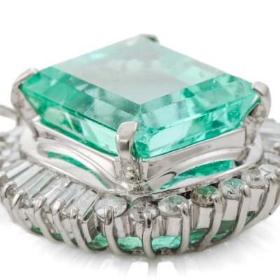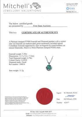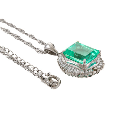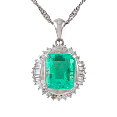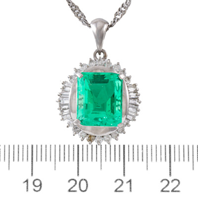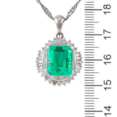 Emerald and Diamond pendant with centre emerald cut Natural Colombian Emerald totalling 5.49ct with round & baguette cut Natural Diamonds totalling 0.70ct (Estimated grading: GH SI). Platinum - 900 with 50cm Platinum - 850 adjustable chain. Weight: 11.2g. With Certificate #422477.